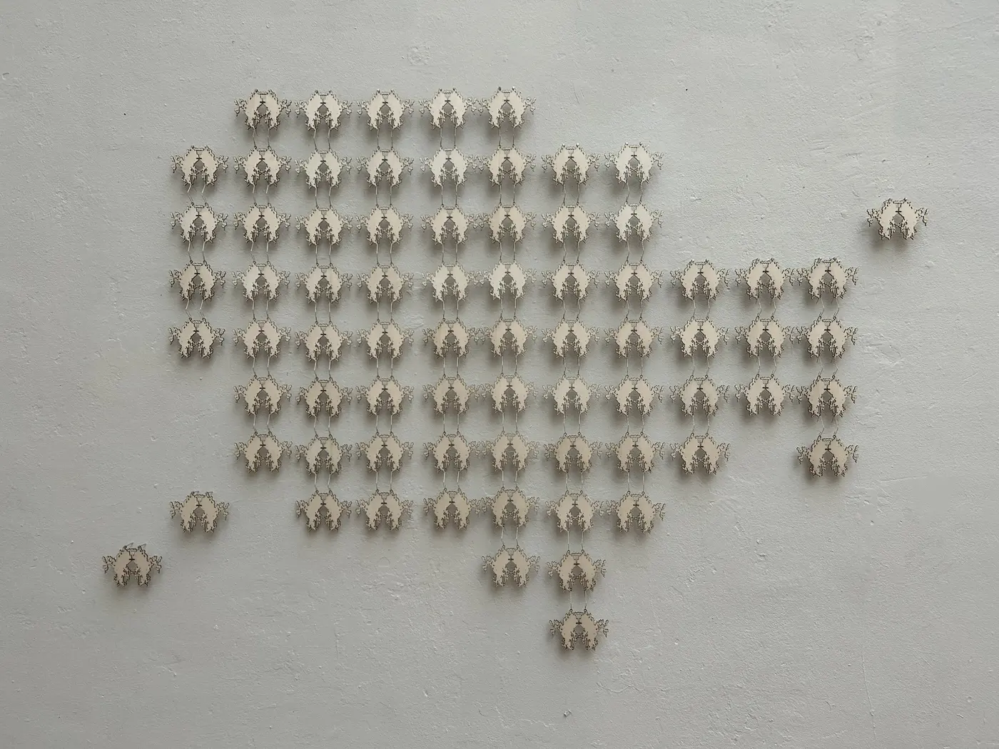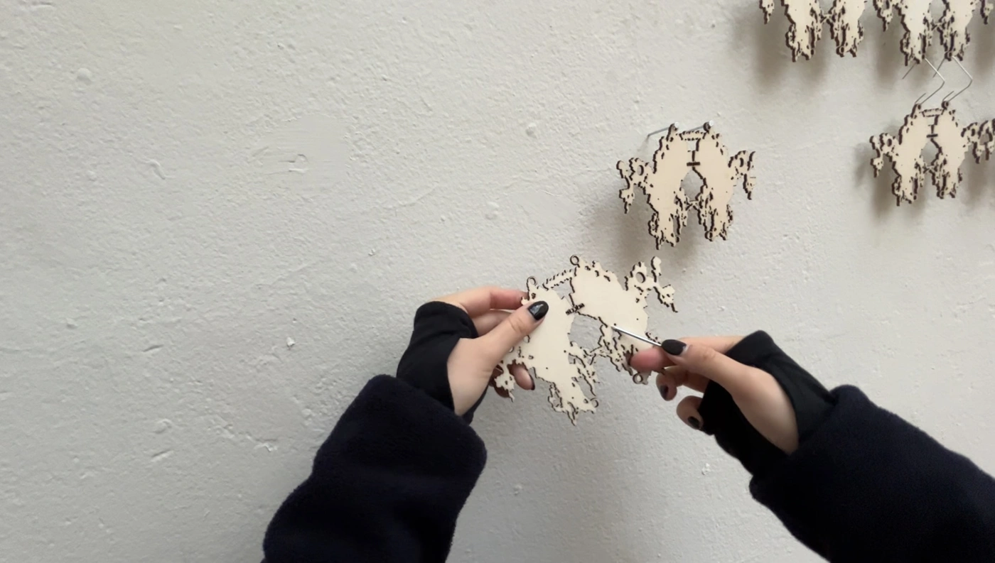chainmail body armor, is composed of 74 Rorschach-inspired shapes that were lasercut from wooden birch